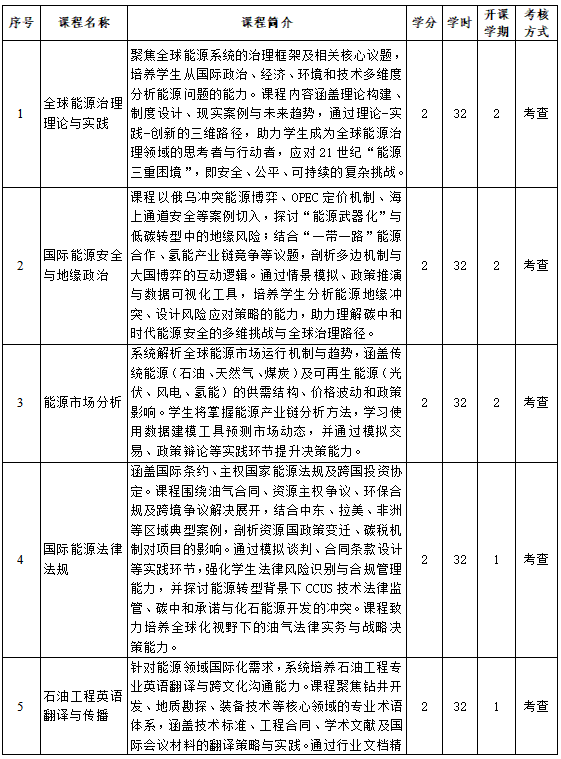 微专业课程采取理论与实践相结合的教学方法,注重学生批判性思维与能源政策研究型思维。基础课程包括《全球能源治理理论与实践》《国际能源安全与地缘政治》《能源市场分析》《国际能源法律法规》《石油工程英语翻译与传播》和《第二外语》六门课程。