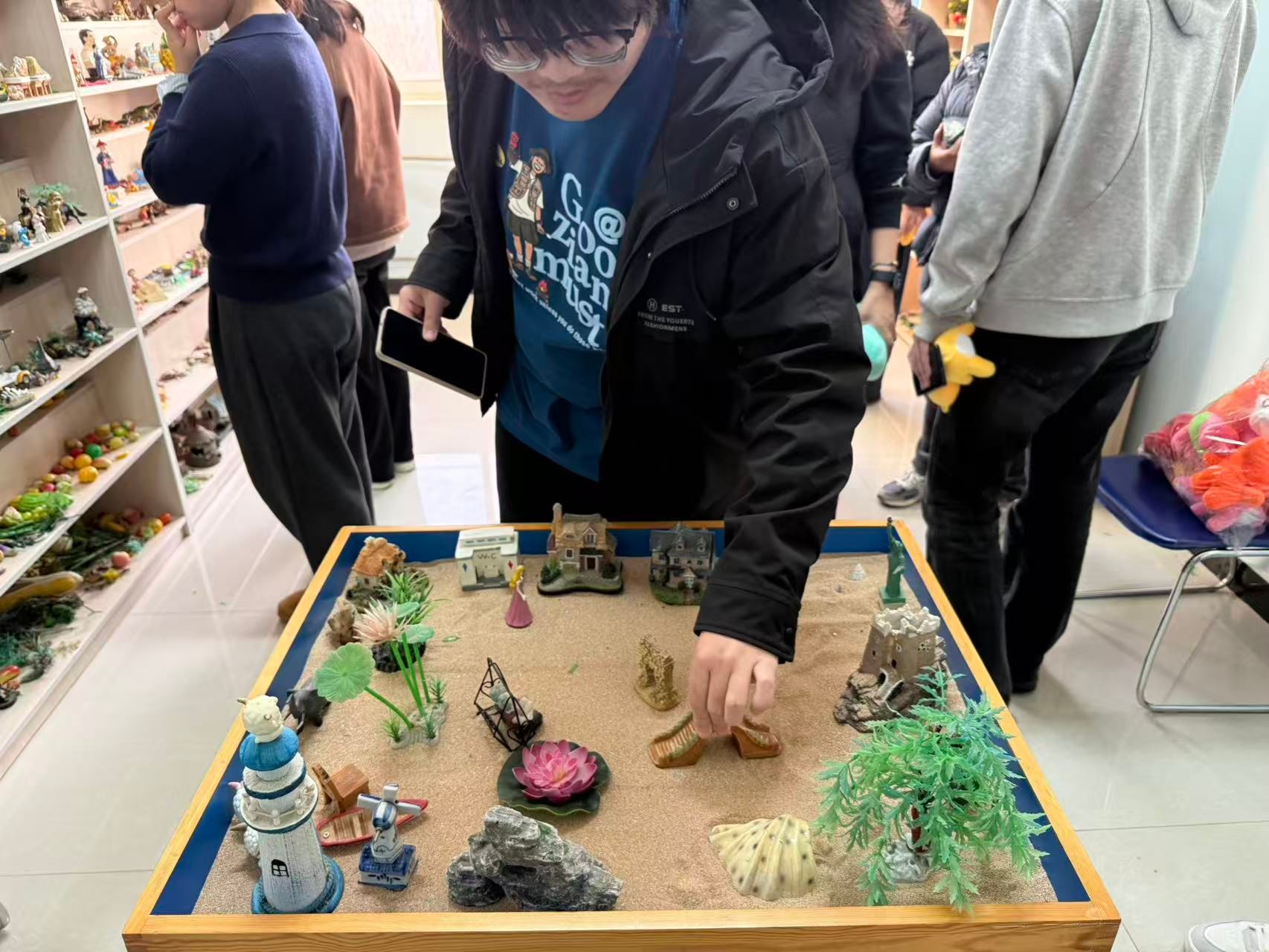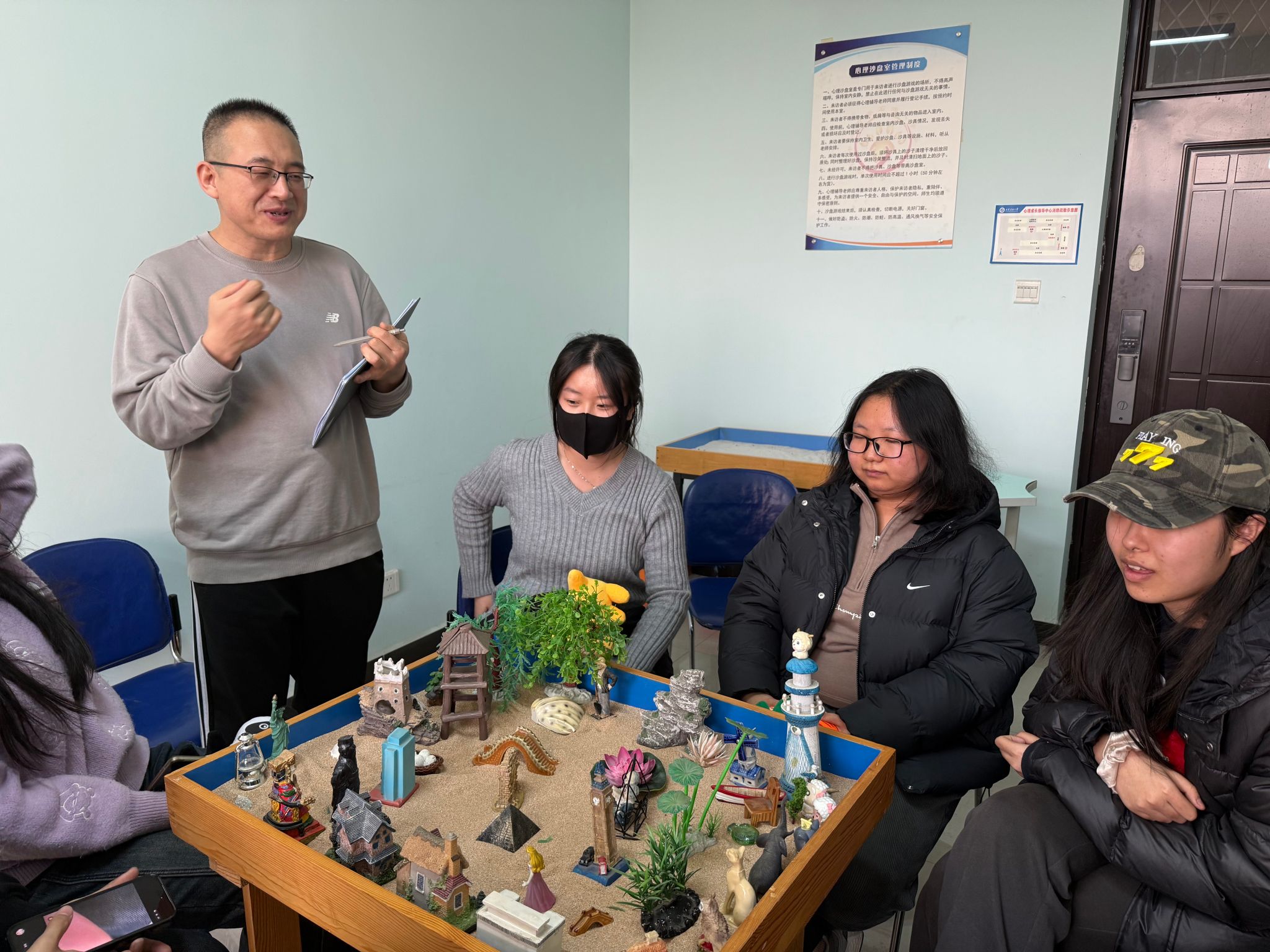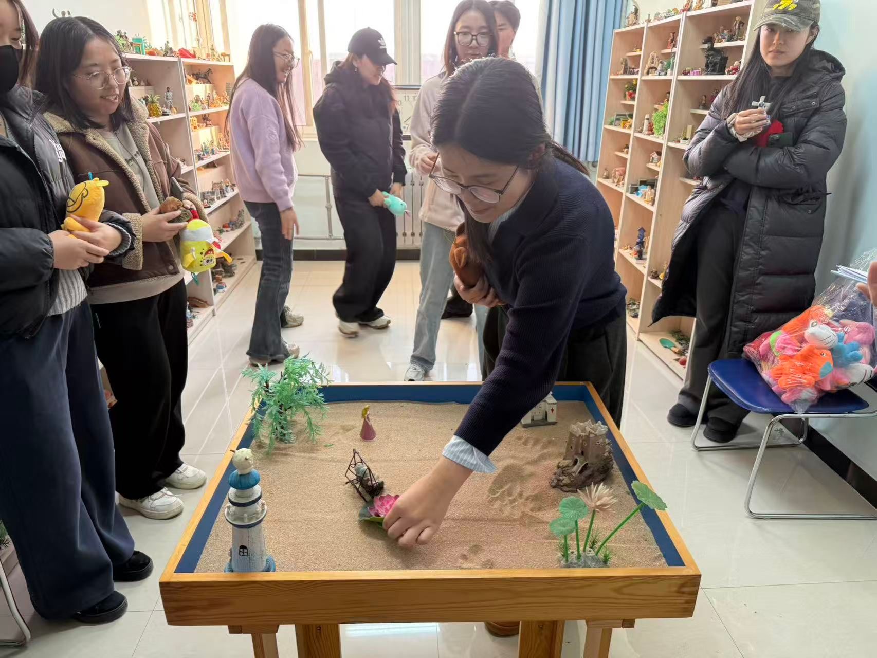 在沙盘心理测试与分享交流环节,学生在闫老师的分组引导下走进心理沙盘室。大家面对陈列架上涵盖人物、建筑、自然、交通等多个类别的数百件沙具,暂时放下复习的疲惫,遵循内心直觉挑选沙具,在特制沙盘内通过堆沙、摆放道具等方式,构建出专属的“心理图景”。过程中,心理老师全程跟进观察,细致记录学子的沙具选择顺序、摆放位置及情绪变化,为后续的解读交流积累基础。