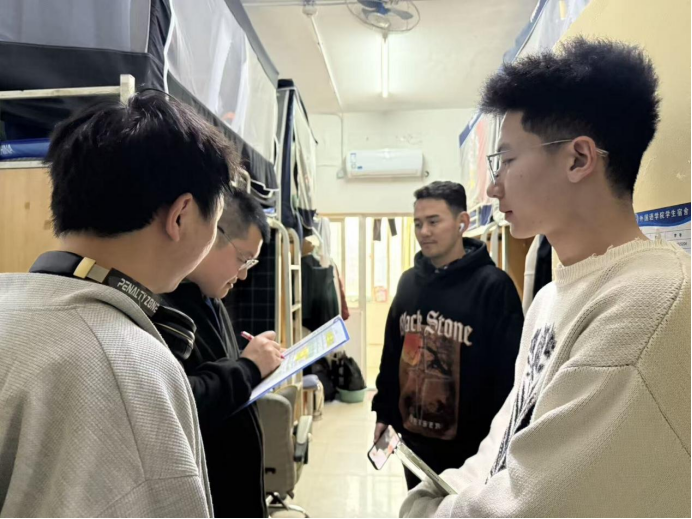 共建文明宿舍,营造安全小家。宿舍是学生生活的重要场所,也是安全管理重点区域。12月8日下午,辅导员对宿舍进行了走访和检查,着重排查了违规电器、存放易燃易品等安全隐患,提醒学生要做到人走断电、锁好门窗,切实防火防盗等安全隐患,督促学生即查即改。通过排查,引导学生遵守管理规定,将安全教育融入日常,共创安全、温馨居住环境。