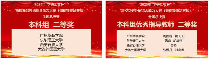 2025年12月27日,由中国国际贸易学会主办,北京学研汇智网络科技有限公司联合主办的第五届“学研汇智杯”高校商务外语综合能力大赛(微视频作品赛项)(以下简称“大赛 ”)全国总决赛成功举办。我校共有4支队伍晋级升级复赛,最终一支队伍闯入全国总决赛并获得第二名的好成绩。