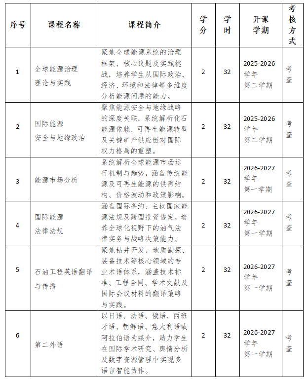 3.具备创新与团队合作能力:培养学生的创新意识、实践能力和团队合作精神,具备能够承担国际组织、政府部门或能源企业相关工作的基本能力,推动能源治理体系优化与全球可持续发展。